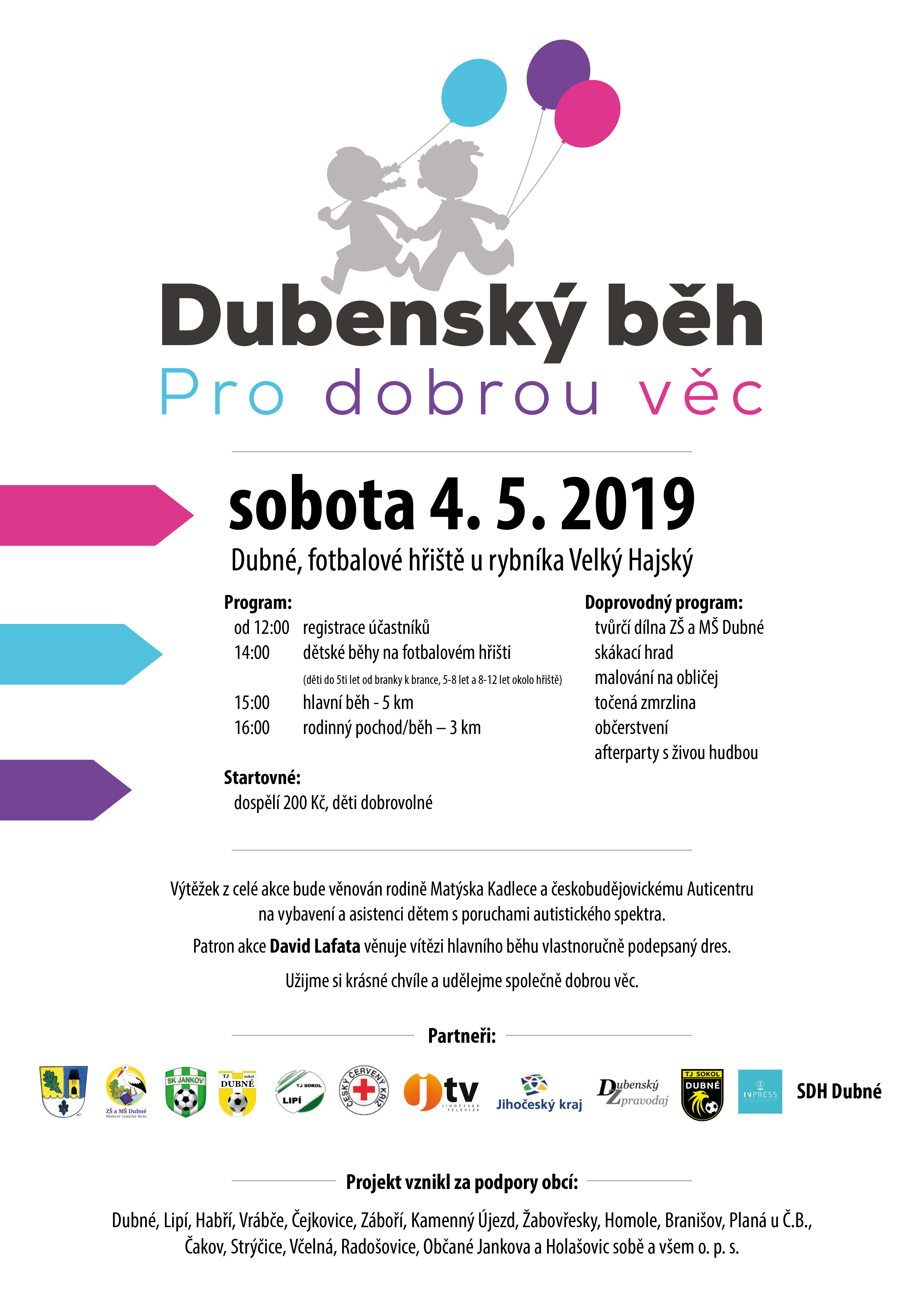 Spojit skvělou zábavu a sportovní zážitek s charitou. To je cílem benefiční akce „Dubenský běh pro dobrou věc“, jejíž čtvrtý ročník se bude konat v sobotu 4. května 2019 od 13h v obci Dubné na Českobudějovicku.